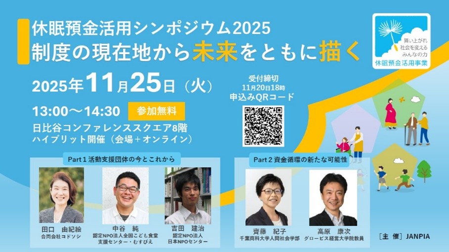 休眠預等活用制度の指定団体である一般財団法人日本民間公益活動連携機構(所在地:東京都千代田区、理事長:二宮 雅也、英文名: Japan Network for Public Interest Activities、略称:JANPIA)は、2025年11月25日(火)に「休眠預金活用事業シンポジウム2025 制度の現在地から未来をともに描く」を開催します。
