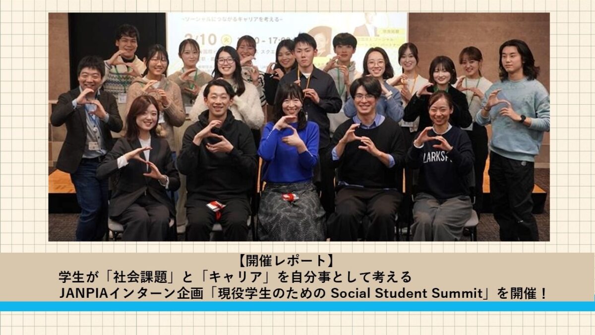 一般財団法人日本民間公益活動連携機構(所在地:東京都千代田区、理事長:二宮雅也、英文名:Japan Network for Public Interest Activities、略称:JANPIA)は、2026年2月10日(火)、東京都千代田区・日比谷国際ビルにて、学生向けイベント 「現役学生のための Social Student Summit」 を開催しました。