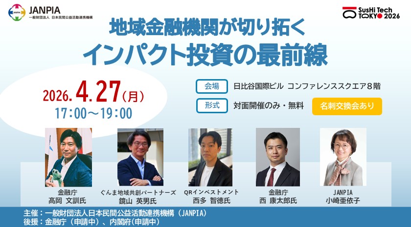 一般財団法人日本民間公益活動連携機構(所在地:東京都千代田区、理事長:二宮 雅也、英文名:Japan Network for Public Interest Activities、略称:JANPIA)は、2026年4月27日(月)に、「地域金融機関が切り拓くインパクト投資の最前線」を開催します。